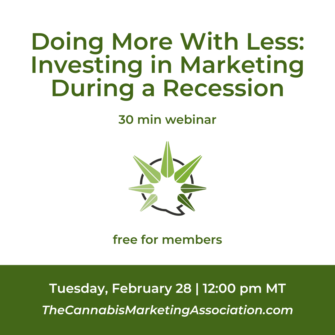 Join Cannabis Marketing Association at 12:00 pm MT on February 28 for “Doing More With Less: Investing in Marketing During a Recession”, moderated by CMA Founder & CEO, Lisa Buffo.
