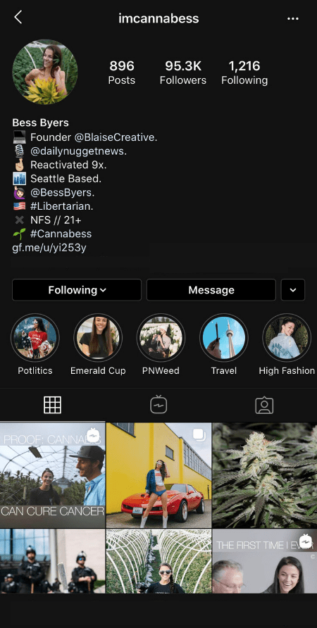 Before packing your bags and leaving town, network. Join Meetup groups centered around cannabis, try and attend cannabis conferences, and — I cannot stress this enough — put yourself out there. Follow successful cannabis influencers like Bess to get inspiration as to what you want your page to look like and go with it.
