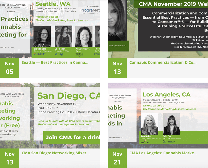 Meet the top cannabis marketing and communications professionals at our local events. Networking opportunities are available at every Cannabis Marketing Association panel discussion, speaker presentation, networking mixer, and more.